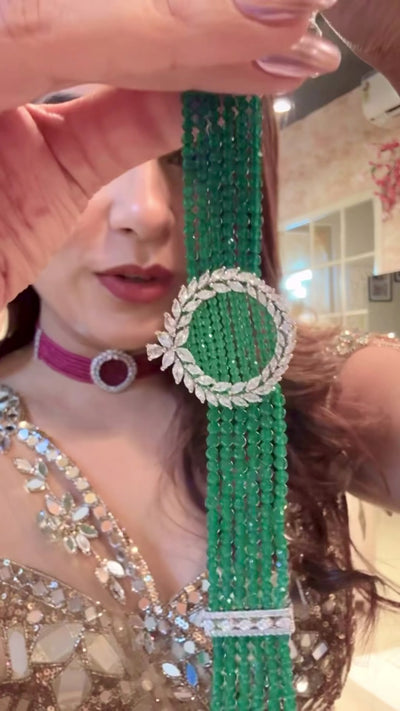 Adorn yourself with elegance in this stunning multi-strand choker necklace set. Crafted with rows of rich emerald green beads, this statement piece features an exquisite circular pendant centrally adorned with brilliant diamond simulants in a delicate leaf and floral motif. Two rectangular bars of sparkling stones add structural beauty along the band. The set is completed with matching round stud earrings, echoing the intricate diamond-like border of the pendant. This choker is a perfect blend of traditional charm and contemporary design, making it an ideal choice for weddings, festive occasions, and glamorous parties.