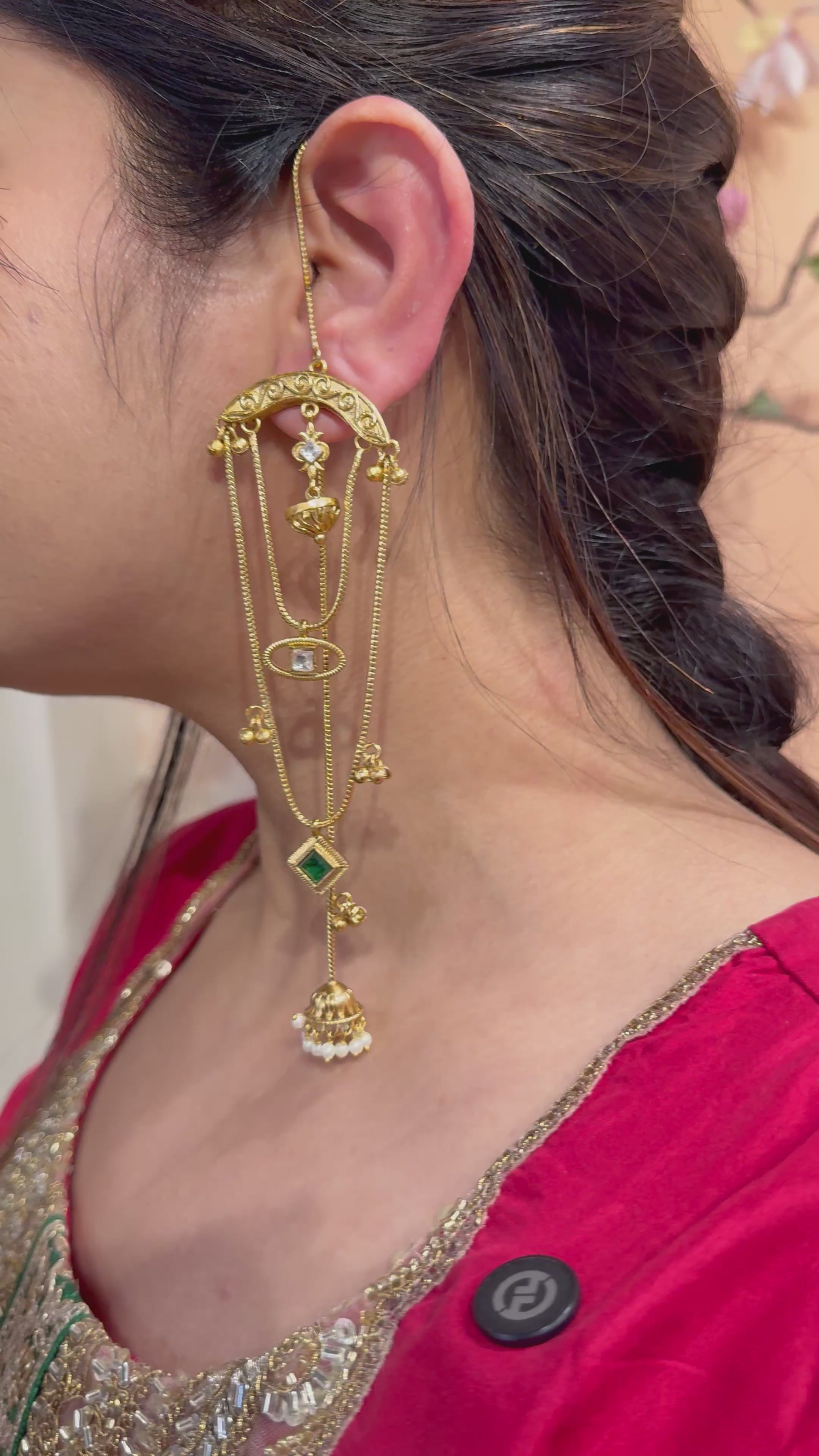 Sahare (Chains) Long, delicate gold-toned chains that extend from the top piece, designed to be secured either in the hair or along the ear cartilage, adding a regal flair. Long, delicate gold-toned chains (Sahare).