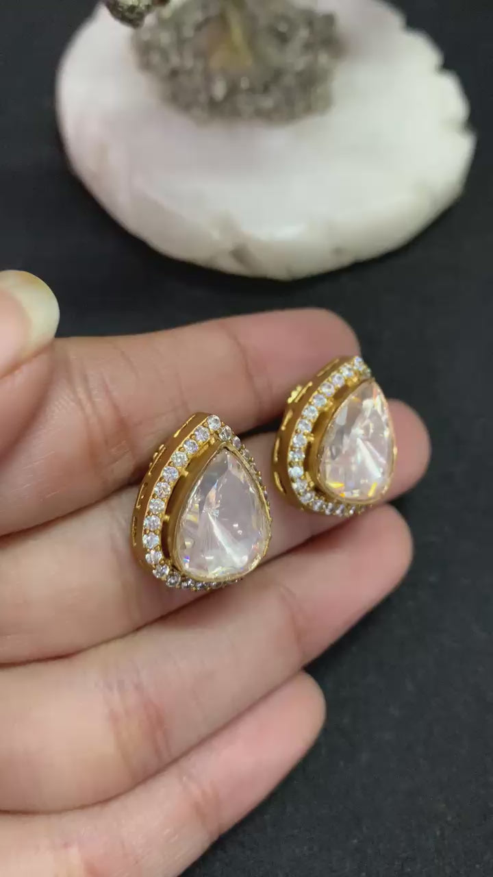 This super fine finish moissanite polki Victorian earings option for the festive season. This is made up of high quality polki kundan and surrounded by hydro n semi precious polki . New Victorian earrings center polki is superior spark white imitation stone So, don't miss out on this gorgeous polki studs this eventful season as you have ramps to walk ahead.