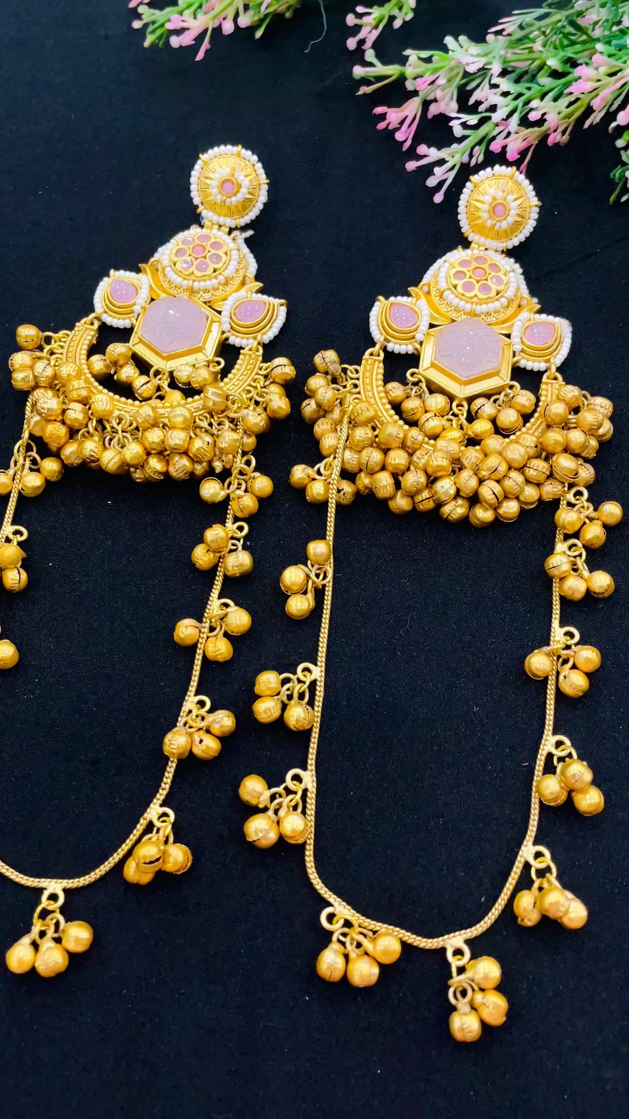 They are adorned with small, round, white beads or pearls, and tear-drop shaped gold accents that dangle from the main structure.