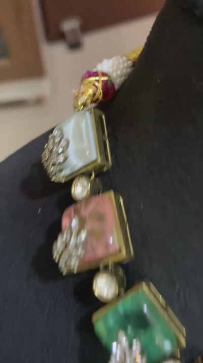This polki neckpiece & is the ultimate accessory option for the festive season. This is made up of high quality polki kundan and surrounded by hydro n semi precious polki . The neckpiece has vibrant detailing all over. This is also has a bright element of kundan detailing in its structure. So, don't miss out on this gorgeous polki neckpiece this eventful season as you have ramps to walk ahead