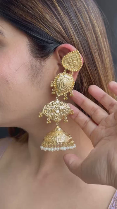 Elevate your traditional attire with these stunning gold-toned temple jhumka earrings. Crafted with intricate filigree work and a classic dome shape, these earrings exude a regal and timeless charm.
