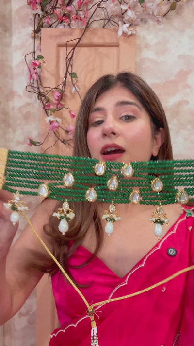 This is a stunning traditional Indian choker necklace set, perfect for weddings, festivals, and special occasions. It combines the richness of ruby-red beads with the elegance of Kundan work and pearls.
